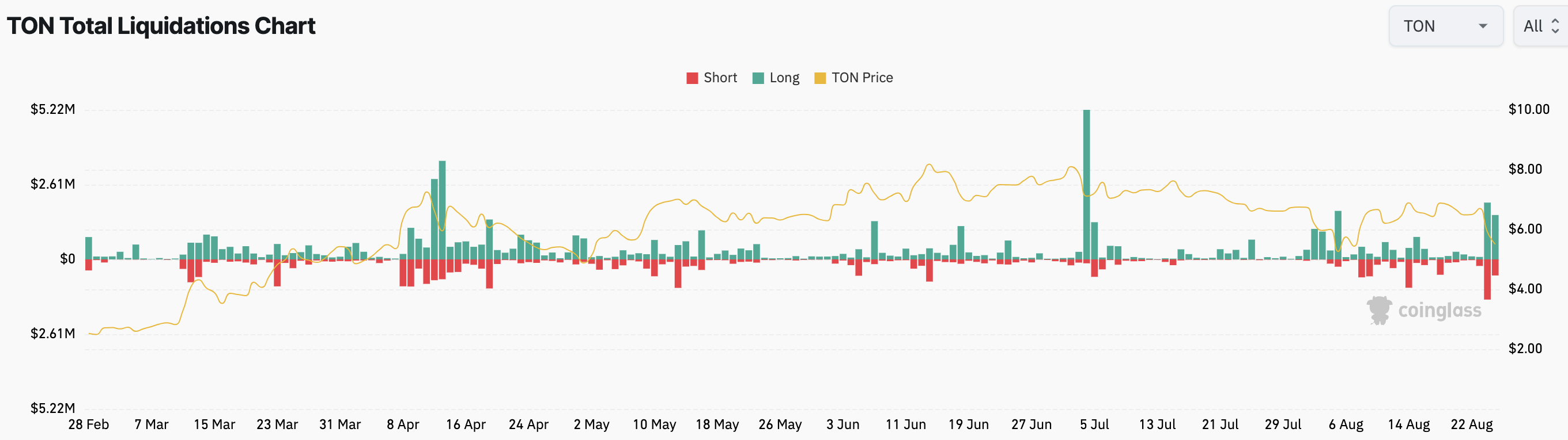 Det er viktig å merke seg at likvidasjoner, sammen med stigende OI, kan påvirke prisutviklingen. Gitt økningen i åpen interesse sammen med betydelige lange likvidasjoner, kan TONs pris oppleve ytterligere nedgang før en eventuell oppgang.