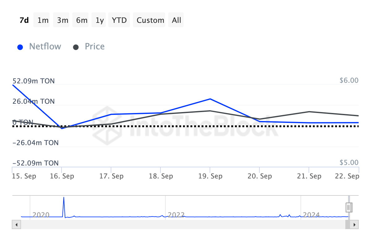Denne metrikken sporer om store investorer akkumulerer eller distribuerer tokens. Et fall antyder at flere tokens blir solgt enn kjøpt av disse nøkkelaktørene. Hvis denne trenden fortsetter, kan Toncoins kurs møte en betydelig nedgang, noe som gjør det usannsynlig for tokenet å nå $ 7-merket på kort sikt.