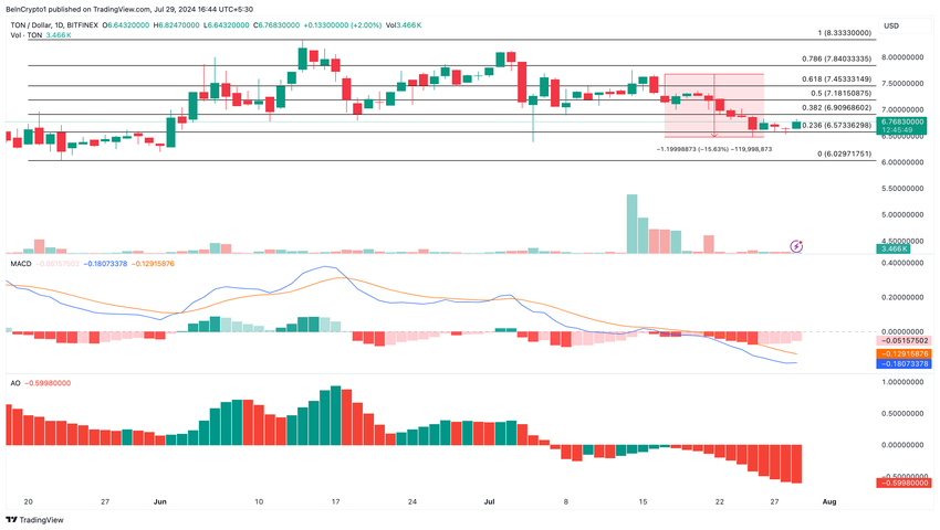 For øyeblikket er MACD nede i det røde området, forsterker muligheten for en nedadgående trend. Hvis dette fortsetter, kan prisen på TON falle til $ 6,57. Men hvis salgspresset øker, kan verdien falle til $ 6,02.