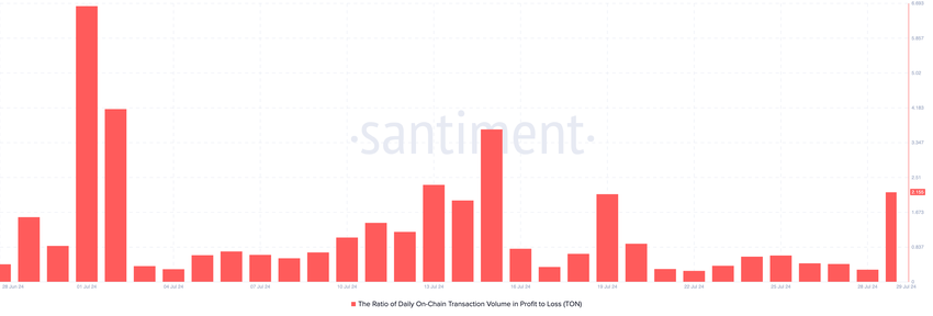 Som et resultat av TONs prisoppgang, nådde forholdet mellom daglige on-chain transaksjoner i fortjeneste til tap sitt høyeste nivå siden 19. juli. Denne metrikken viser om tokenholdere realiserer tap eller fortjenester. Når den er negativ, er det flere realiserte tap enn gevinster.