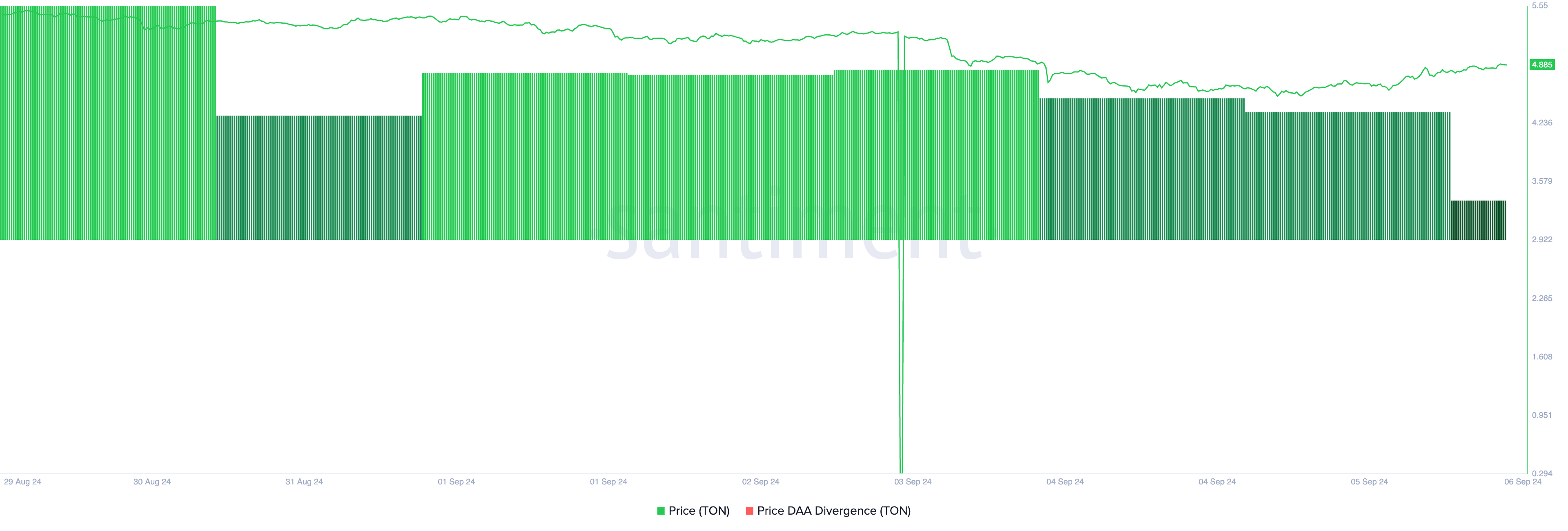Den positive stemningen rundt denne uttalelsen har ført til en økning i Toncoins verdi. TON er den største vinneren i markedet, med en prisøkning på 7 % de siste 24 timene. Prisøkningen støttes av betydelig etterspørsel, som bevises av dens positive pris daglig aktiv adresse (DAA) divergens.