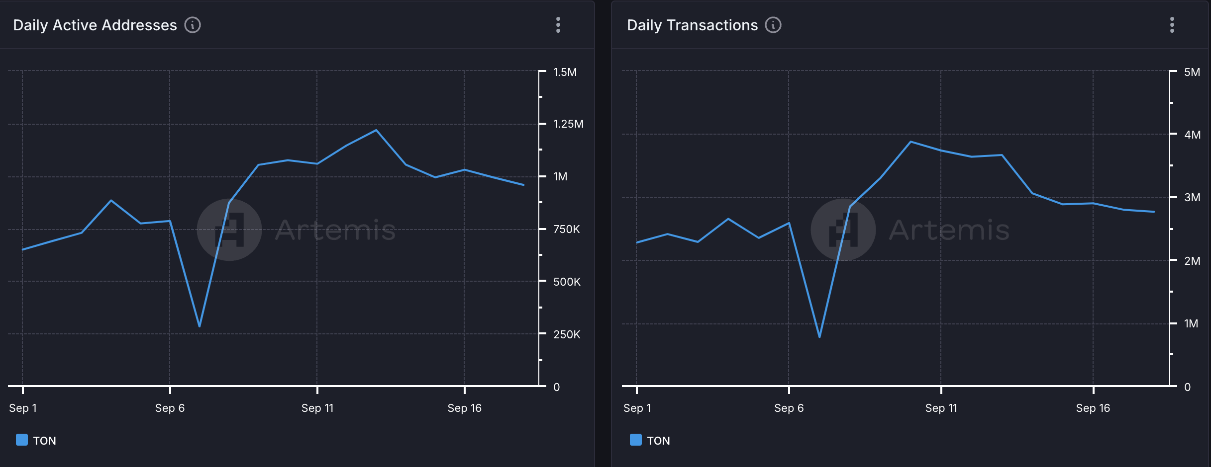 I et intervju med BeinCrypto bekreftet Juan Pellicer, en seniorforsker hos IntoTheBlock, at TON har blitt det nest mest aktive nettverket denne måneden. I begynnelsen av september behandlet nettverket rundt 3 millioner daglige transaksjoner og opprettholdt et gjennomsnitt på 2,4 millioner per dag den påfølgende uken.