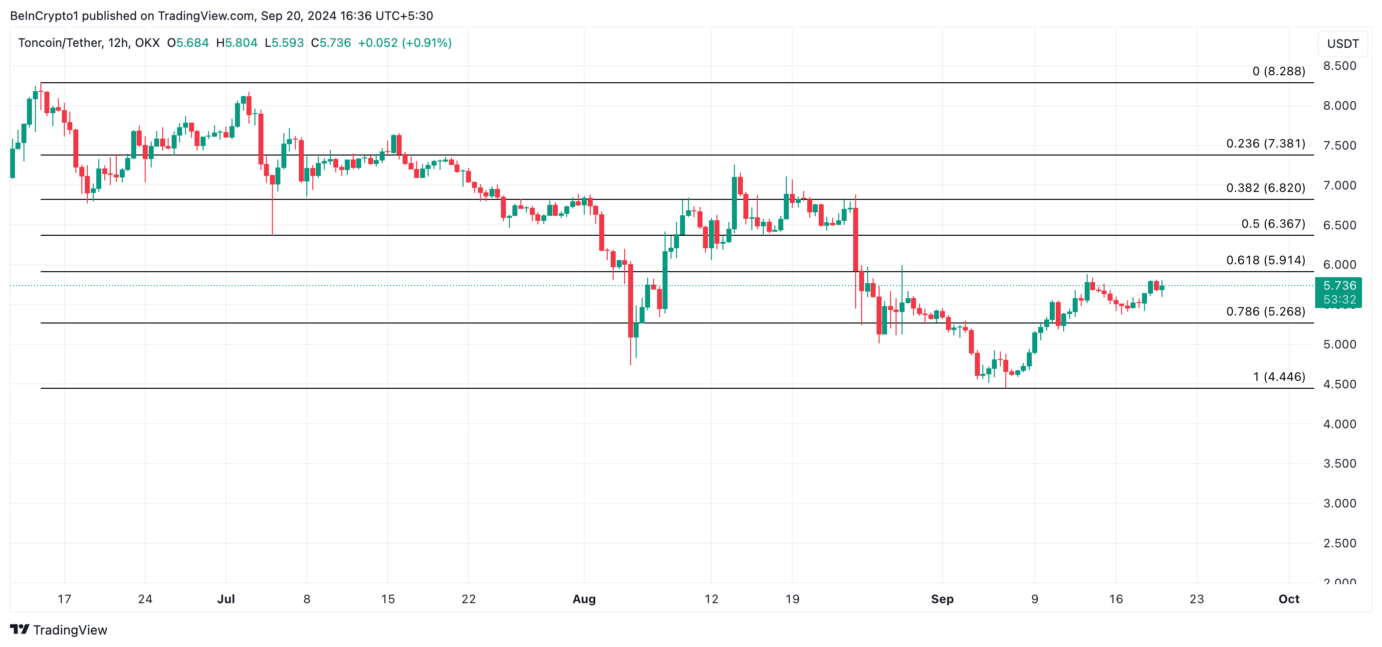 Men hvis salgsaktiviteten intensiveres, kan Toncoin miste sine nylige gevinster og potensielt falle til $ 4,46.