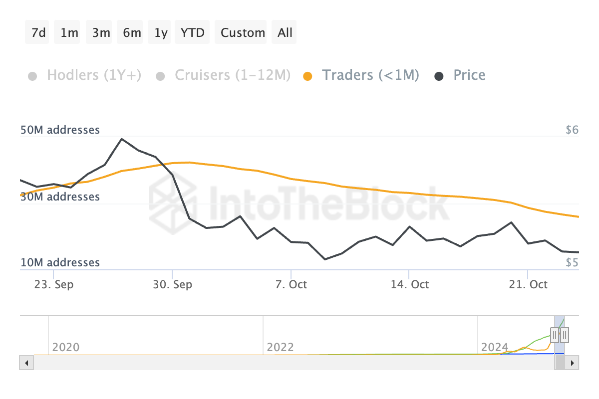 IntoTheBlocks data viser en nedgang på 29 % i deres beholdningstid den siste måneden. Denne nedgangen indikerer at TON-eiere som har holdt sine tokens i mindre enn en måned, holder på sine aktiva i enda kortere perioder før de selger dem.