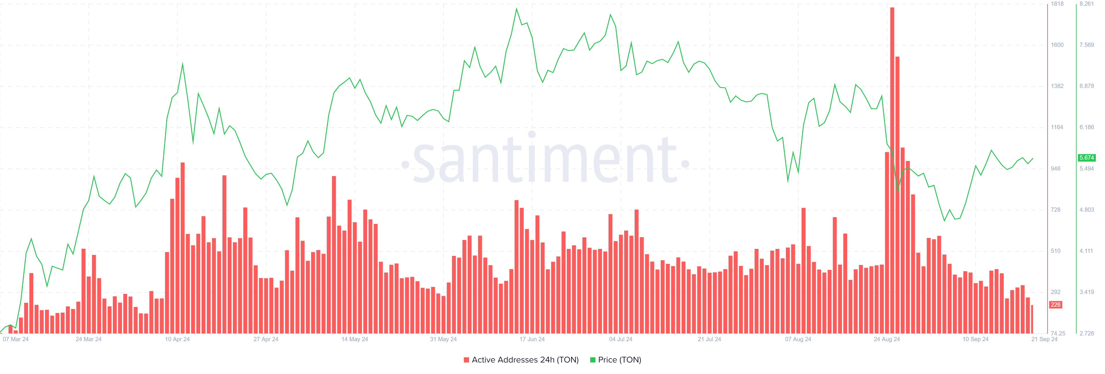 Imidlertid, til tross for dette lovende utsiktene, står Toncoin overfor noen utfordringer i sitt makromomentum. Aktive adresser på Toncoin-nettverket har falt til et fem måneders lavpunkt, noe som indikerer en mangel på investorpartisipasjon. Dette fallet i aktive adresser peker på usikkerhet blant tradere, som kan være forsiktige med tokenets fremtidige potensial.