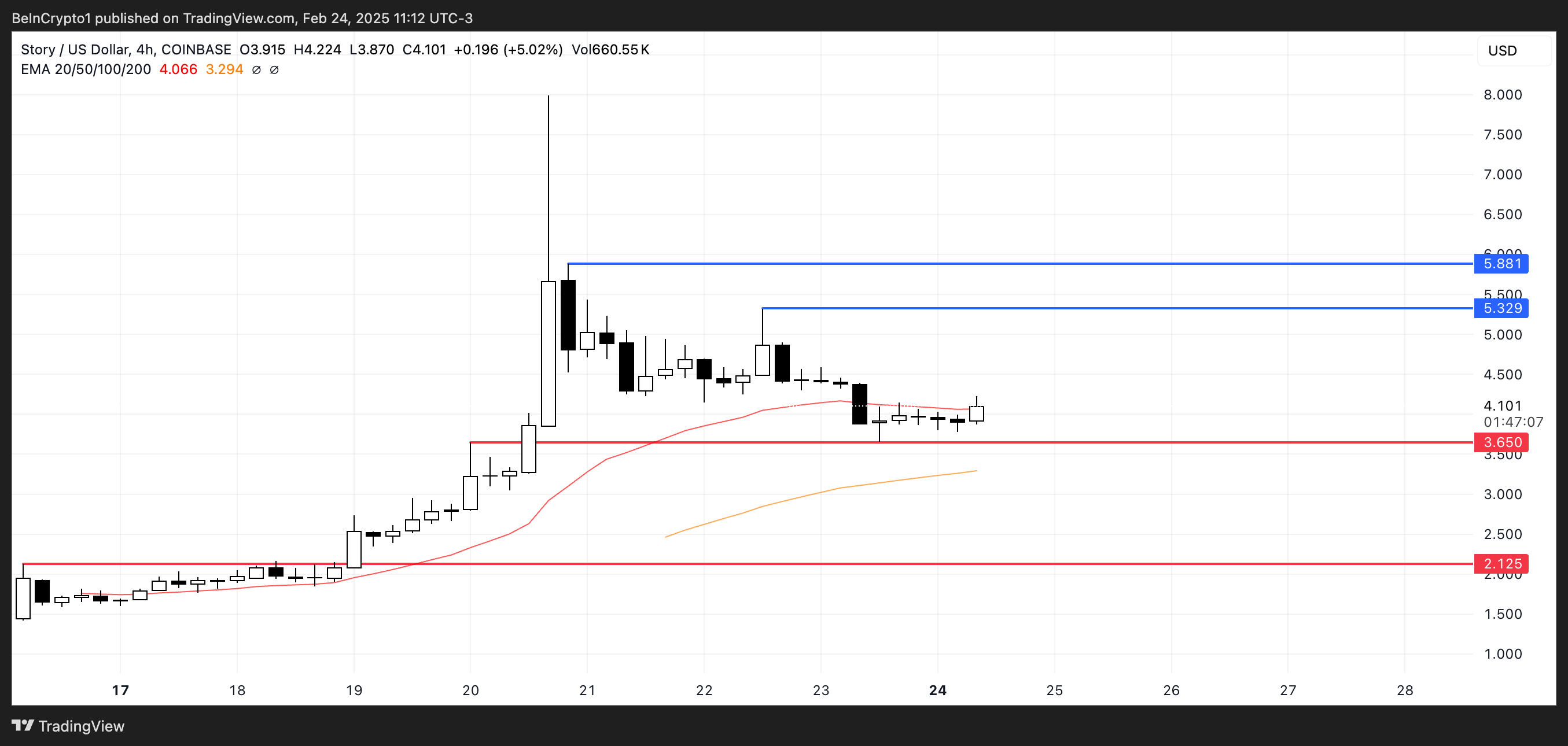 Storys markedsverdi er for tiden på $ 1 milliard, og prisen har økt med 140 % de siste syv dagene, noe som reflekterer sterk bullish momentum. Hvis denne trenden fortsetter, kan IP teste motstandsnivåer på $ 5,32 og $ 5,88 snart, med potensial til å stige over $ 6 eller til og med $ 7.