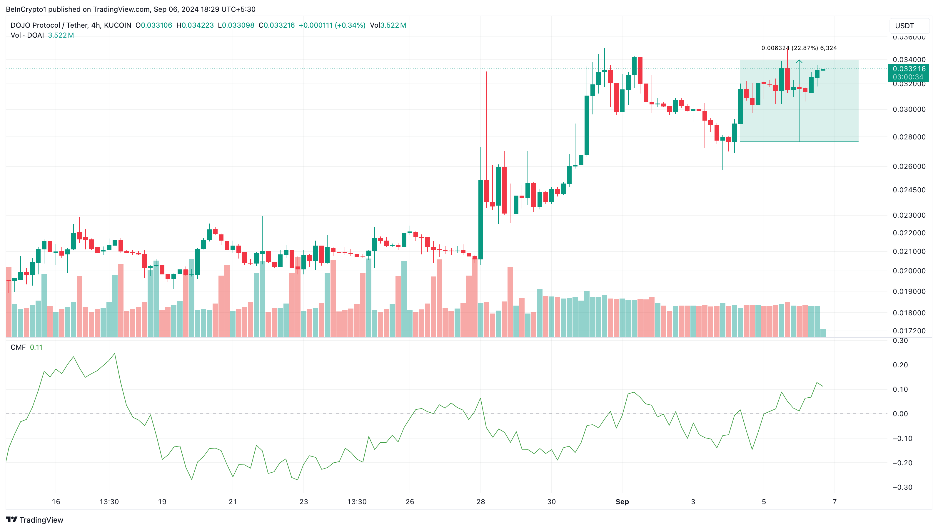 En årsak er Chaikin Money Flow (CMF), en teknisk indikator som viser om akkumulering er høyere eller distribusjon er mer til stede. Fra diagrammet nedenfor økte CMF-avlesningen, noe som indikerer at DOAI forblir under bullish kontroll.