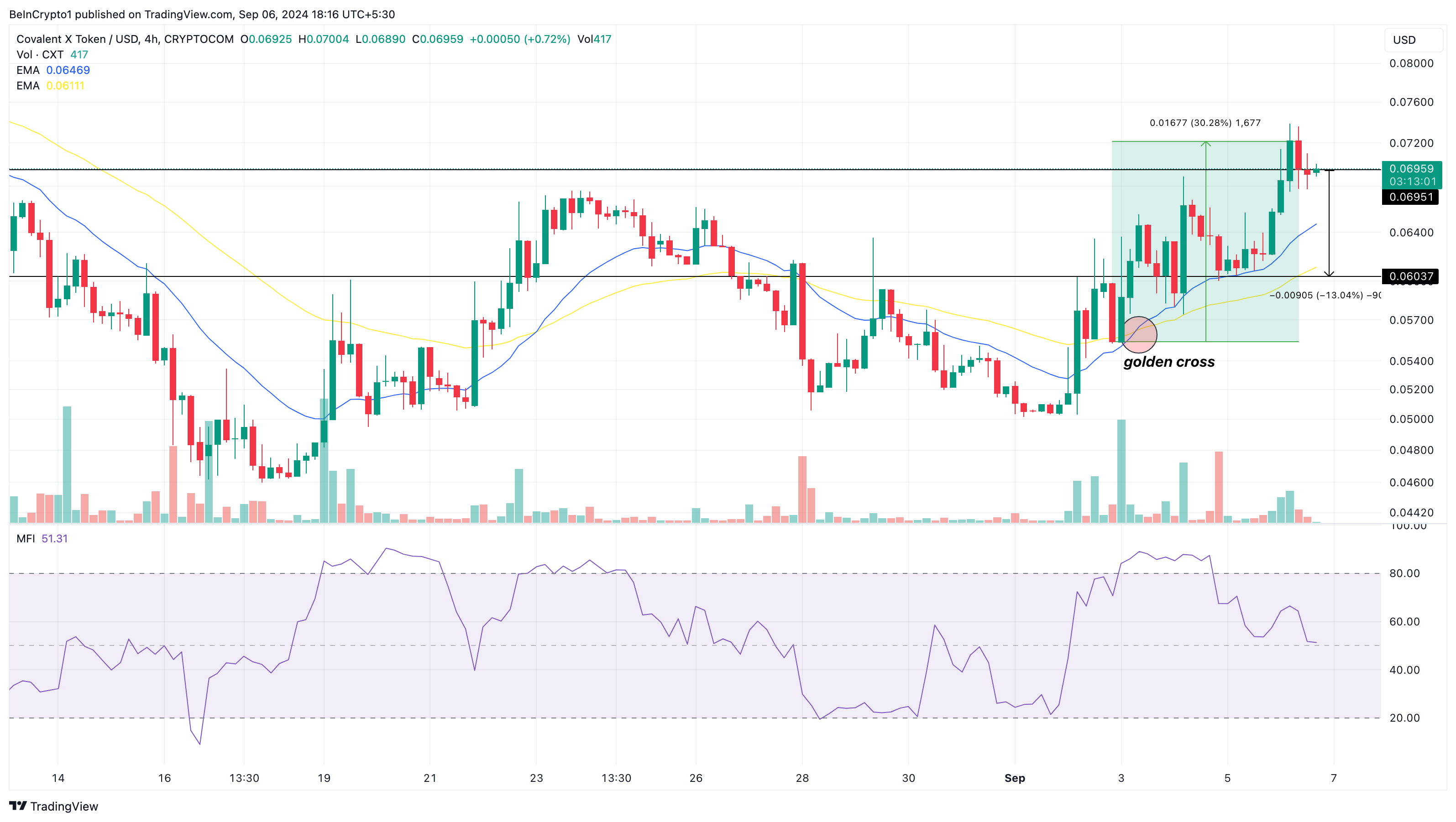 Oppgangen begynte etter at det 20-dagers eksponentielle glidende gjennomsnittet (EMA) krysset over det 50-dagers EMA, og dannet et bullish mønster kjent som et gyllent kryss. I løpet av få dager nådde CXT $ 0,072.