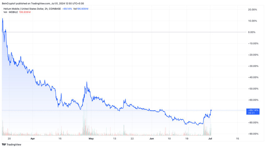 Heliums MOBILE-token er øverst på listen hans. Tokenet har imidlertid vært ned med nesten 70 % siden toppene i mars 2024.