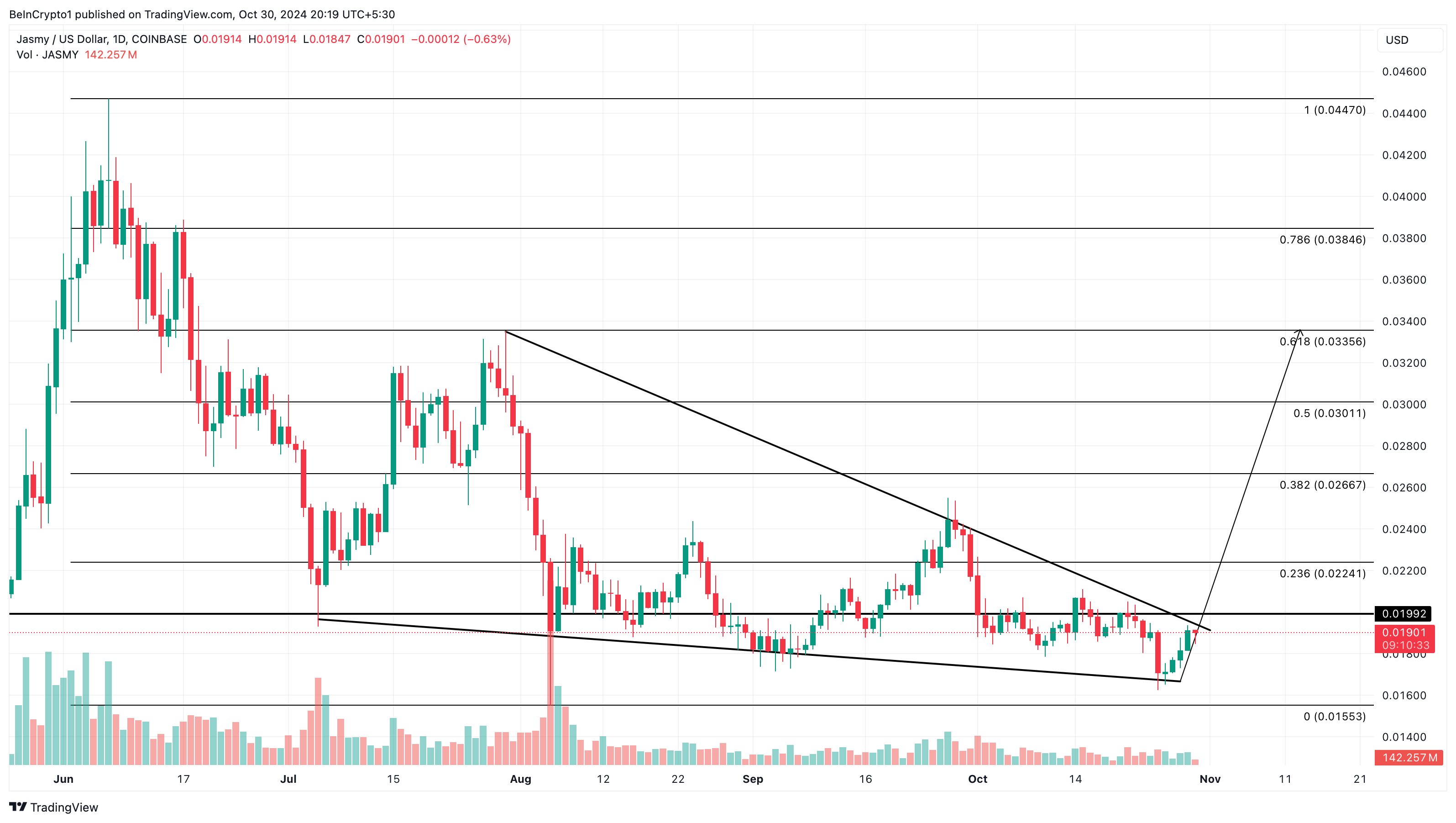 I tillegg har altcoinen dannet en fallende kile, og prisen er i ferd med å bryte ut av den. Når dette skjer, er det sannsynlig at JASMYs pris vil rally mot 61,8 % Fibonacci-sekvensnivået på $ 0,034.