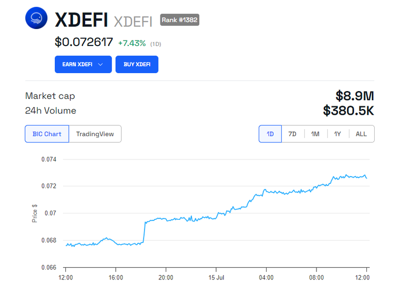 Mange kryptosamfunnsmedlemmer uttrykte sin entusiasme for den kommende XDEFI-iterasjonen. Denne spenningen er tydelig i XDEFIs opprinnelige token, som økte med 7,43 % de siste 24 timene. I skrivende stund handles den for øyeblikket til $0,072617.
