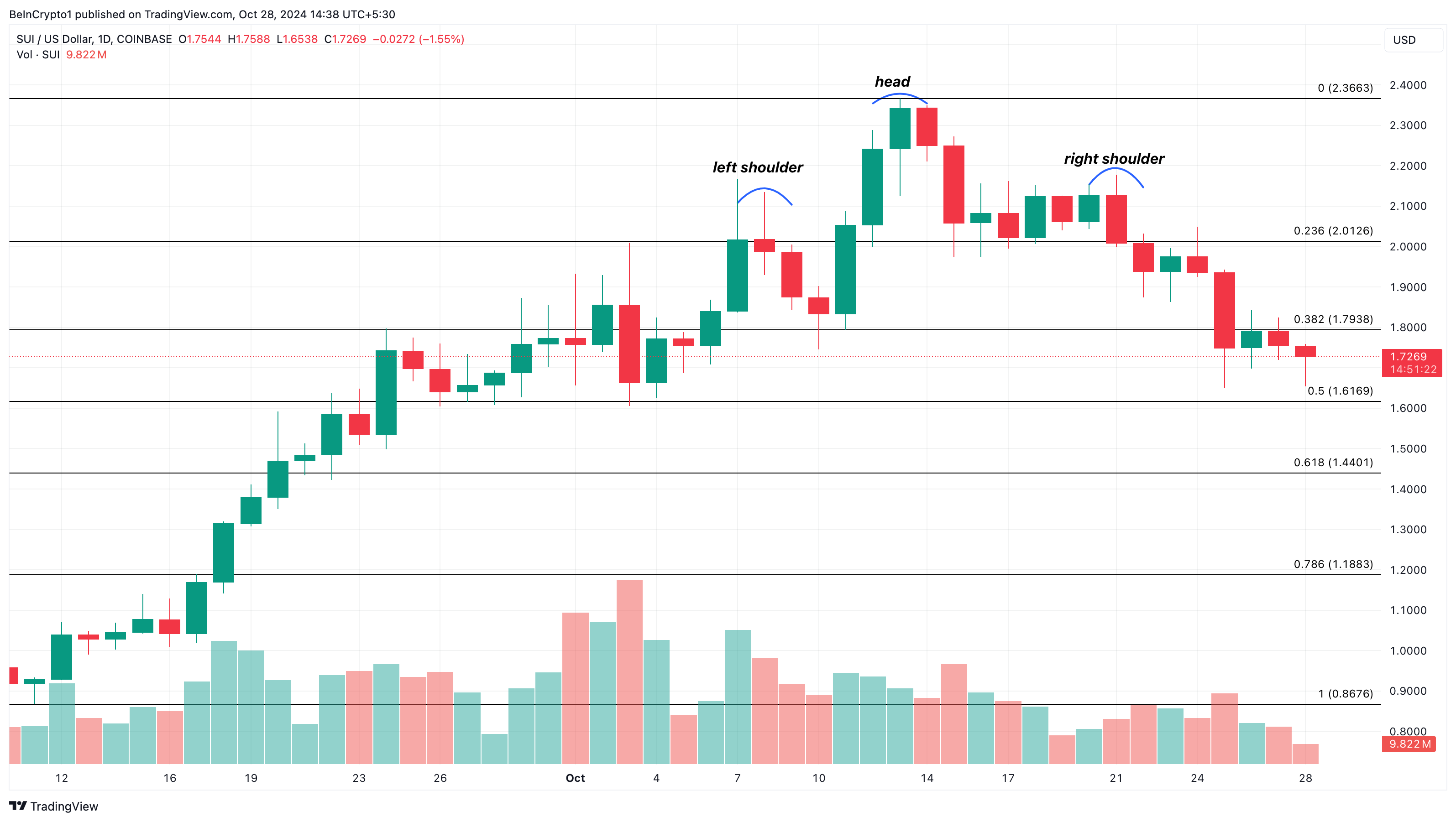 Også, hvis etterspørselen er lavere enn tilbudet rundt den tiden, er prisen sannsynlig å falle. For øyeblikket er SUIs pris på $ 1,73 etter å ha falt med 17 % de siste syv dagene. På det daglige diagrammet har altcoinen dannet et hode og skuldre-mønster, som er et bullish til bearish mønster.