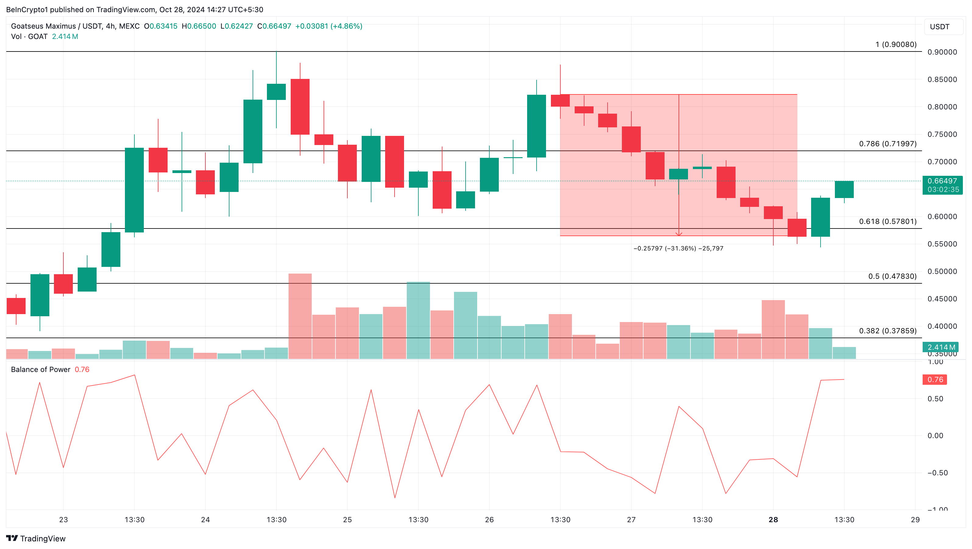 Hvis dette vedvarer, kan GOATs verdi sprette til $ 0,90. På den annen side kan avvisning på $ 0,71 ugyldiggjøre denne prognosen og sende prisen ned til $ 0,48.