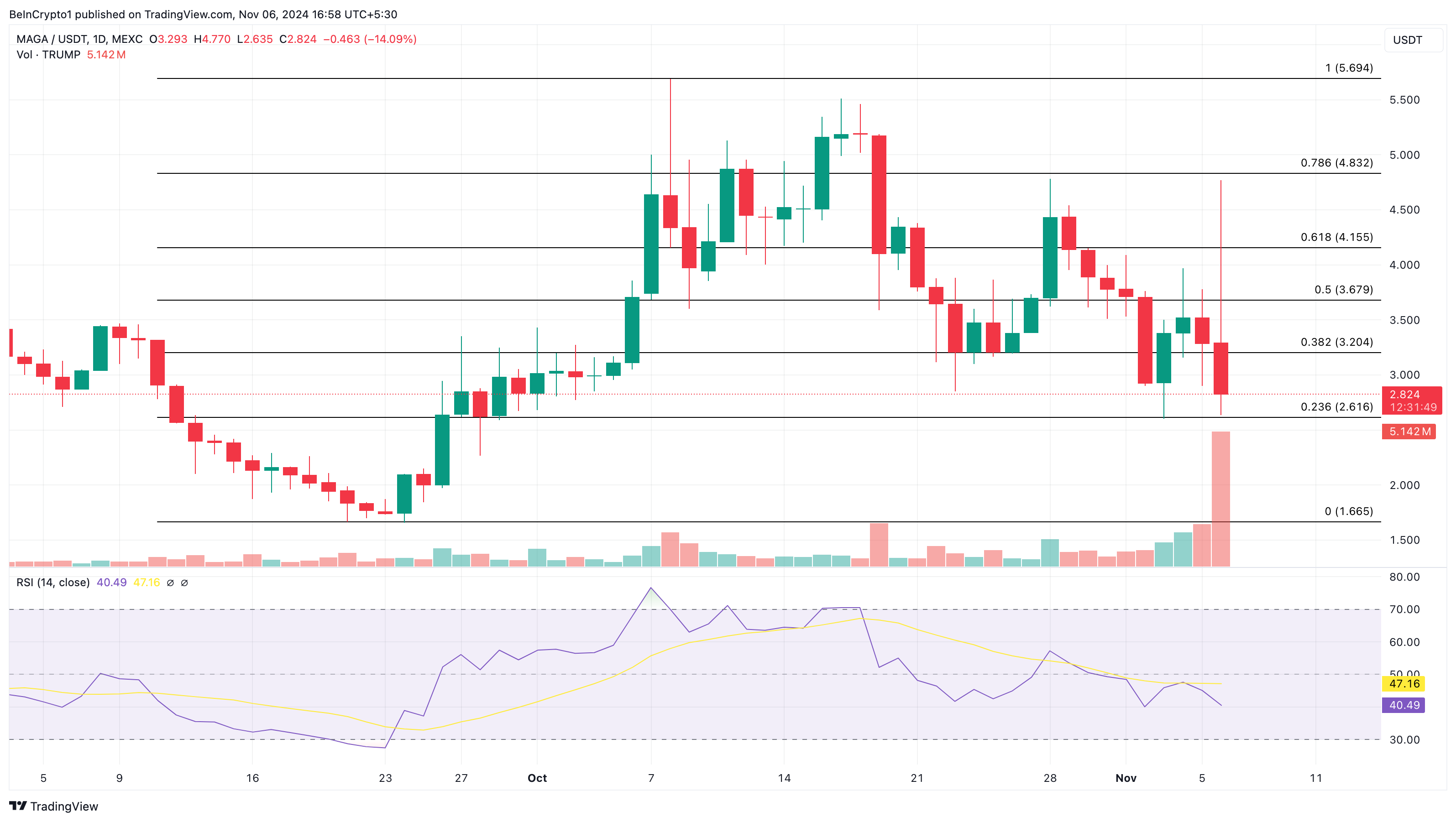 Dette prisfallet tyder på at Trumps valg var en “selg nyheten”-hendelse. Ifølge det daglige diagrammet har Relative Strength Index (RSI) falt under det nøytrale 50,00-punktet, noe som indikerer bearish momentum rundt altcoinens pris.