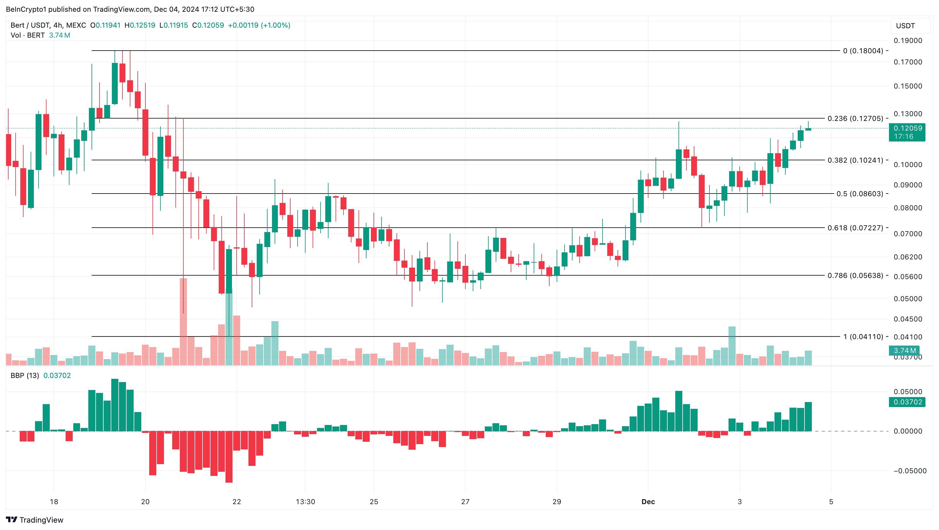 I dag trender BERT fordi prisen har økt betydelig. I løpet av de siste 24 timene har meme coinens verdi økt med 35 % og handles til $ 0,12. Fra et teknisk synspunkt viser 4-timers diagrammet en økning i Bull Bear Power (BBP).