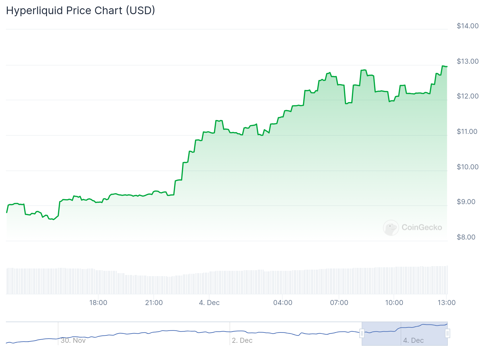 Over de siste 24 timene har HYPEs pris økt med 43,40 % til $ 12,95. Dets 24-timers handelsvolum har også overgått $ 270 millioner, noe som indikerer betydelig interesse for tokenet.