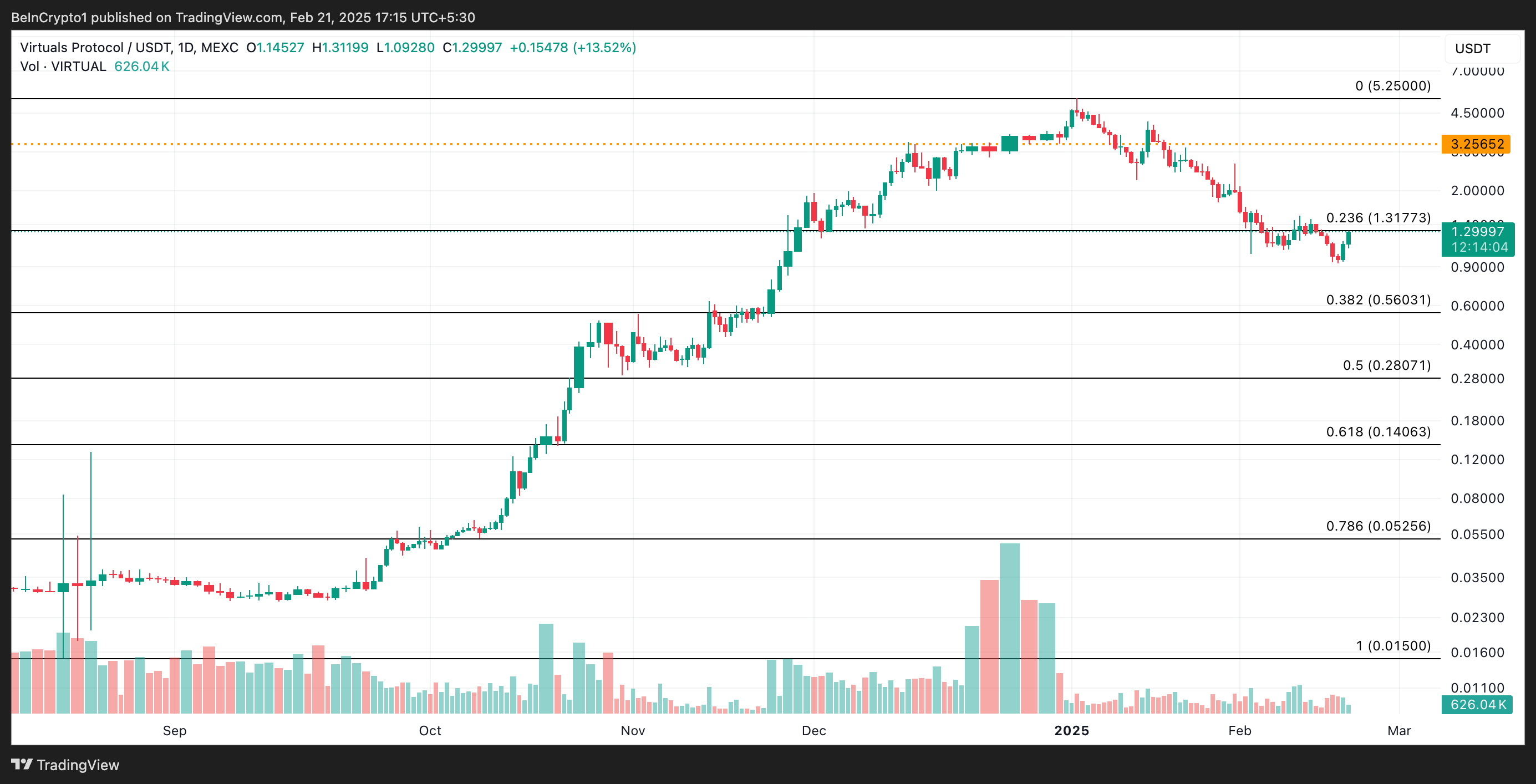 VIRTUAL, den native tokenen som driver den desentraliserte plattformen for opprettelse og inntektsgenerering av AI-agenter, Virtuals Protocol, er også en trendende altcoin i dag. Den handles til $ 1,29, etter å ha registrert en prisoppgang på 25 % det siste døgnet.