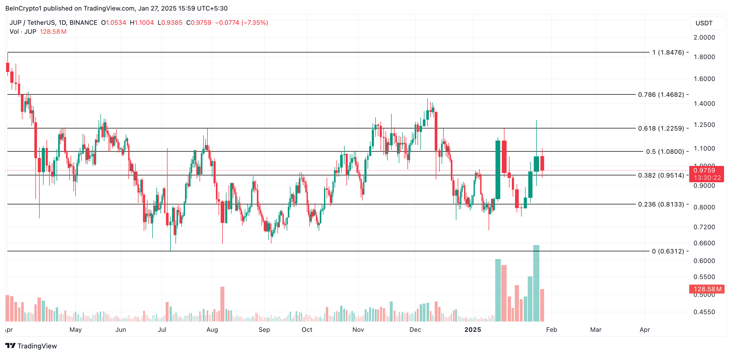 Men hvis salg begynner, kan JUP-prisen falle under $ 0,95 og trende mot $ 0,81.