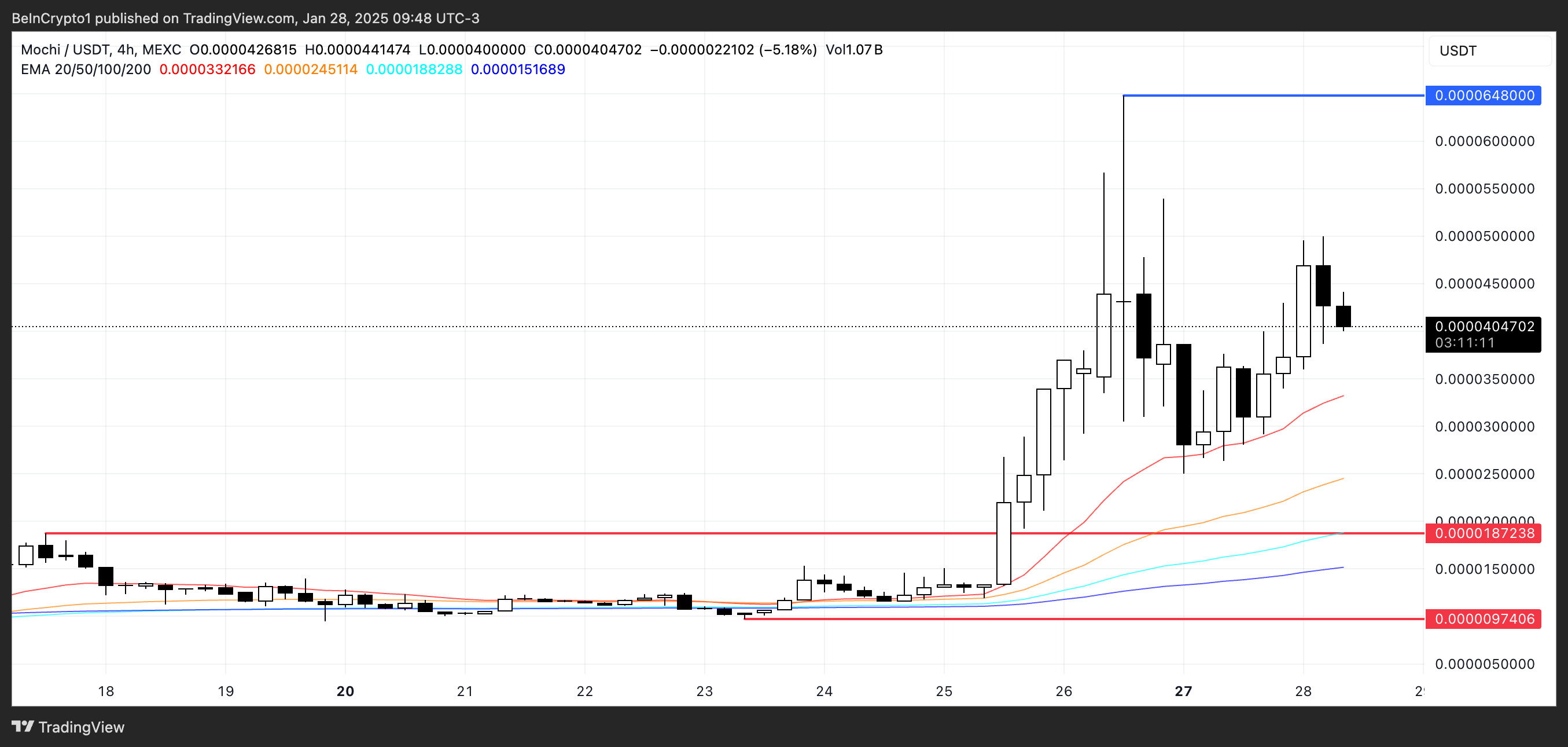 Hvis momentumet holder, kan MOCHI stige videre, og testnivåene kan være nær $ 0,000064. Imidlertid kan en reversering se den falle til $ 0,000018, med en potensiell nedgang til $ 0,0000097 hvis viktige støttenivåer svikter.