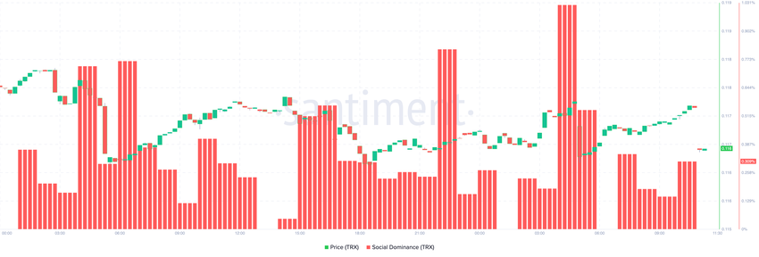 Data fra Santiment viser at Trons sosiale dominans har blitt bedre. I de tidlige timene 12. juni var sosial dominans på nettverket 0, 15%. I skrivende stund har lesingen imidlertid doblet seg til $ 0.30%.