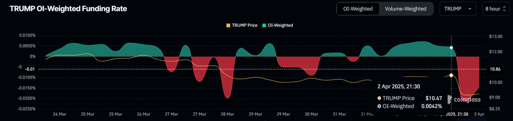 Finansieringsraten for TRUMP ble negativ i løpet av de siste 24 timene, noe som signaliserer økt bearish aktivitet. Tradere skifter til short-kontrakter, og satser på at prisen vil falle ytterligere. Denne endringen i sentiment følger kunngjøringen av tariffene, som til tross for å være et politisk trekk, hadde en negativ innvirkning på TRUMPs pris.