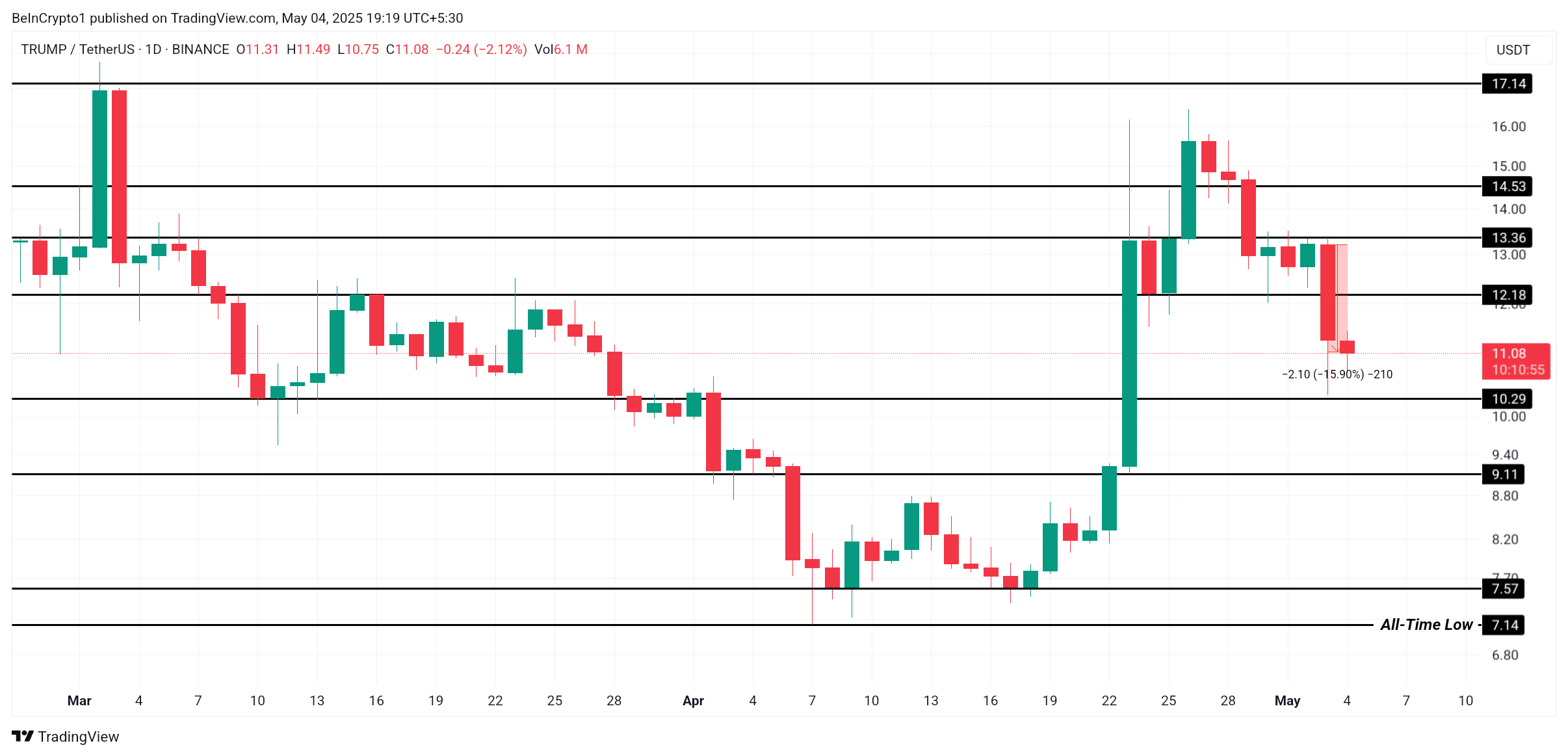 OFFICIAL TRUMP handles for øyeblikket til $ 11,08 etter en skarp 24-timers nedgang på 16 %. Denne nedgangen ble utløst da meme coinen ikke klarte å bryte over den avgjørende $ 16,00 motstanden. Det mislykkede forsøket førte til økt salgspress, og drev aktivaet nedover.