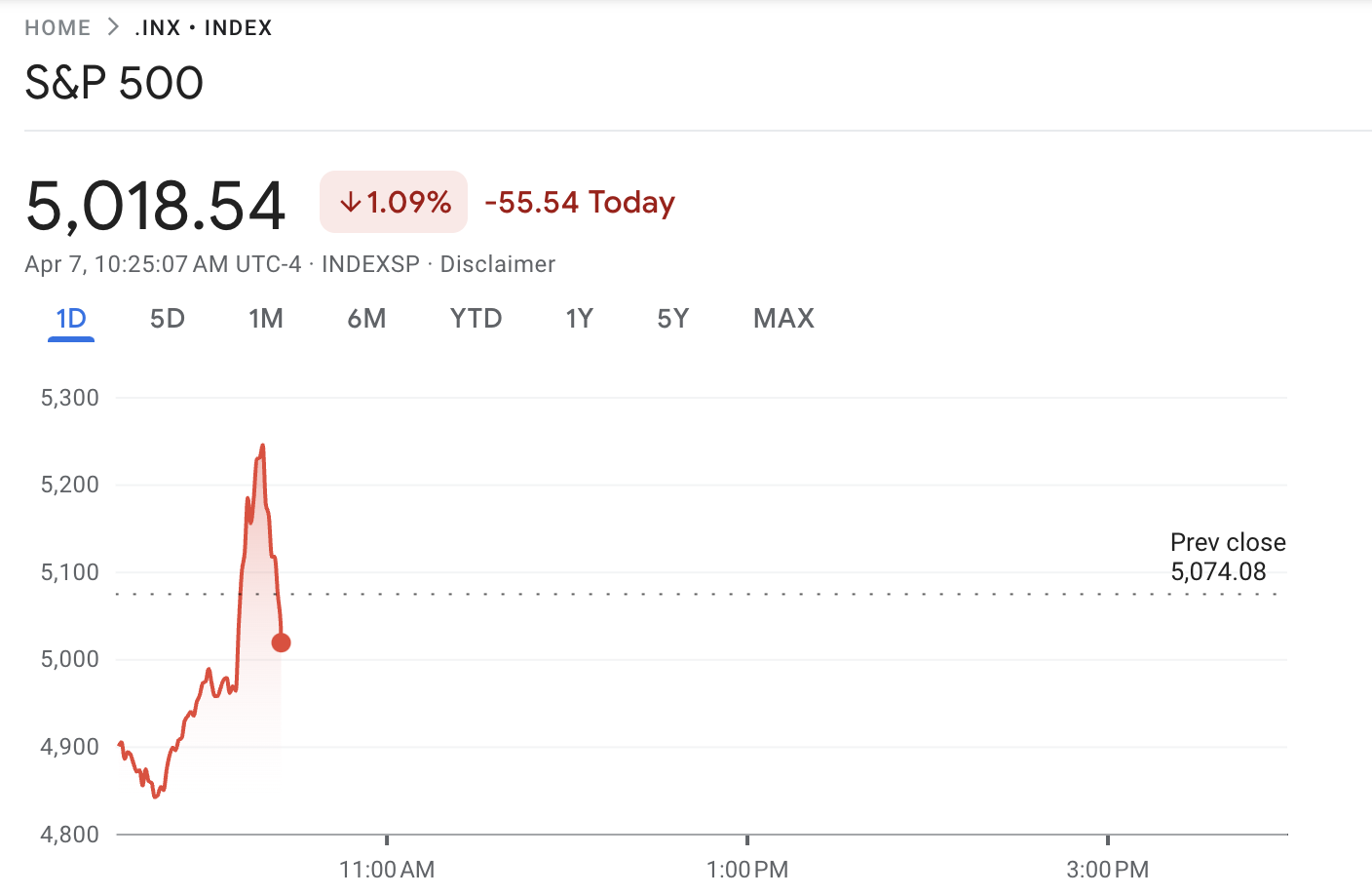 Denne nyheten begynte raskt å sirkulere på nytt, og hevdet at Trump seriøst vurderte en 90-dagers pause i tariffene. Dette skapte en enorm oppgang i de tradisjonelle markedene, med S&P 500 som steg 6 % på sekunder. Imidlertid snudde denne oppgangen raskt igjen.