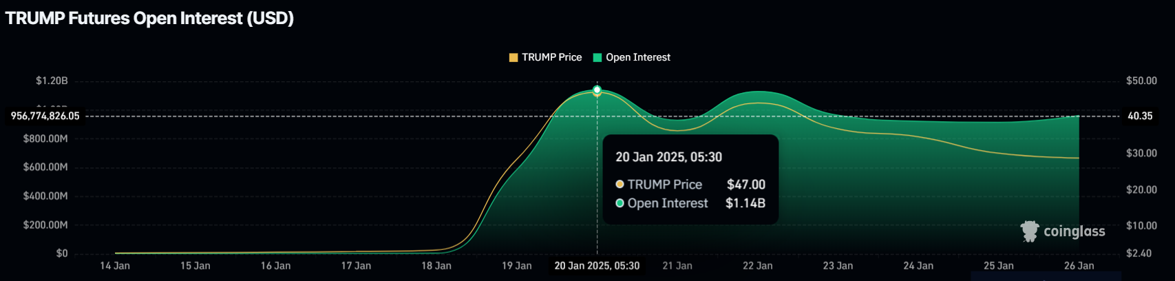 De siste fem dagene har Open Interest (OI) for TRUMP falt betydelig, med en nedgang på $ 200 millioner — fra $ 1,14 milliarder til $ 962 millioner. Denne kraftige reduksjonen i OI indikerer at tradere mister tillit til altcoinen. En slik reduksjon signaliserer avtagende deltakelse i futuresmarkedet, ettersom færre tradere er villige til å spekulere på TRUMPs prisbevegelser.