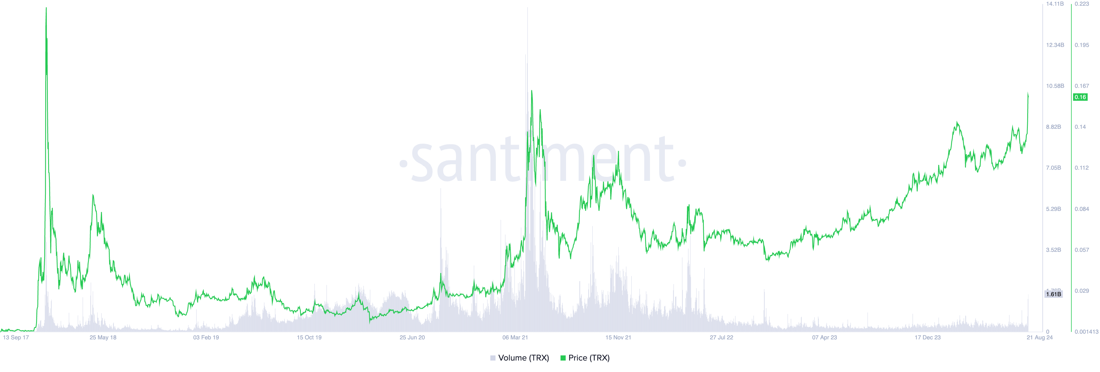 TRX har hatt en prisøkning på 11 % de siste 24 timene. I løpet av den perioden har handelsvolumet økt med 139 %. Med et totalt handelsvolum på $ 1,87 milliarder i skrivende stund, er TRXs daglige handelsvolum på sitt høyeste nivå siden 7. november 2022.