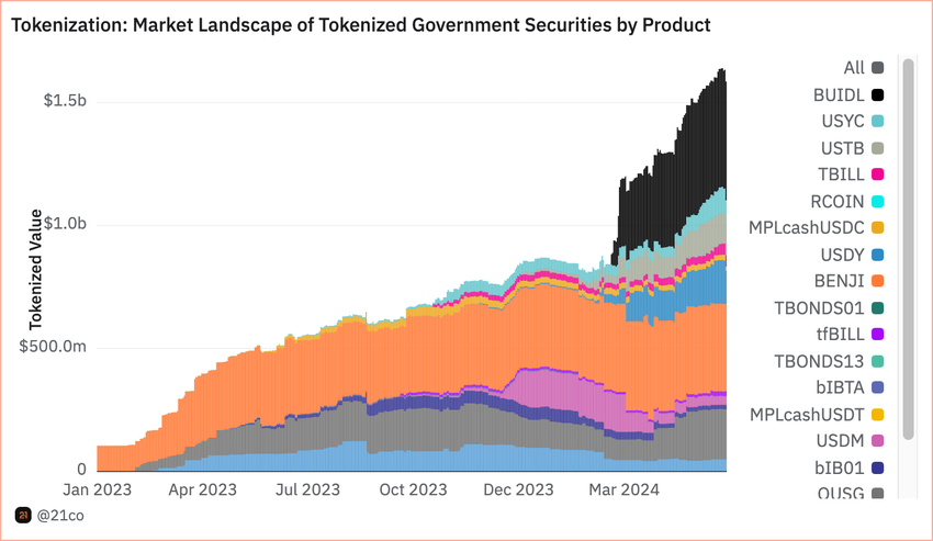 Faktisk har tokeniserte amerikanske statsobligasjoner økt med over 1,000 % siden begynnelsen av 2023. Per 26. juni har markedsverdien deres nådd 1,63 milliarder dollar. Denne veksten fremhever blandingen av tradisjonelle finansielle eiendeler med blokkjede-teknologi, som lover forbedret likviditet og mer effektive transaksjoner.