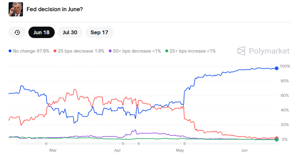 På den ene siden spår Polymarket-brukere en 97,8 % sjanse for at Fed ikke vil gjøre noen renteendringer denne onsdagen.