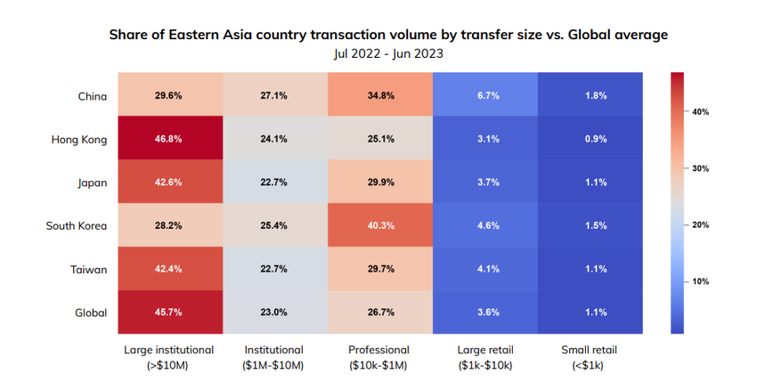 Chainalysis rapporterer at mellom juli 2022 og juni 2023 nådde transaksjonsvolumet i Hong Kong rundt 64 milliarder dollar. OTC-markedet i regionen bidro hovedsakelig til tallet.