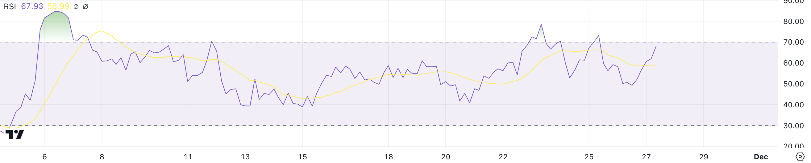 Verdier over 70 indikerer overkjøpte forhold og en potensiell korreksjon, mens verdier under 30 antyder oversolgte forhold og mulig oppgang. Den nåværende RSI på 67 antyder at UNI nærmer seg overkjøpt territorium, men fortsatt har rom for ytterligere gevinster.
