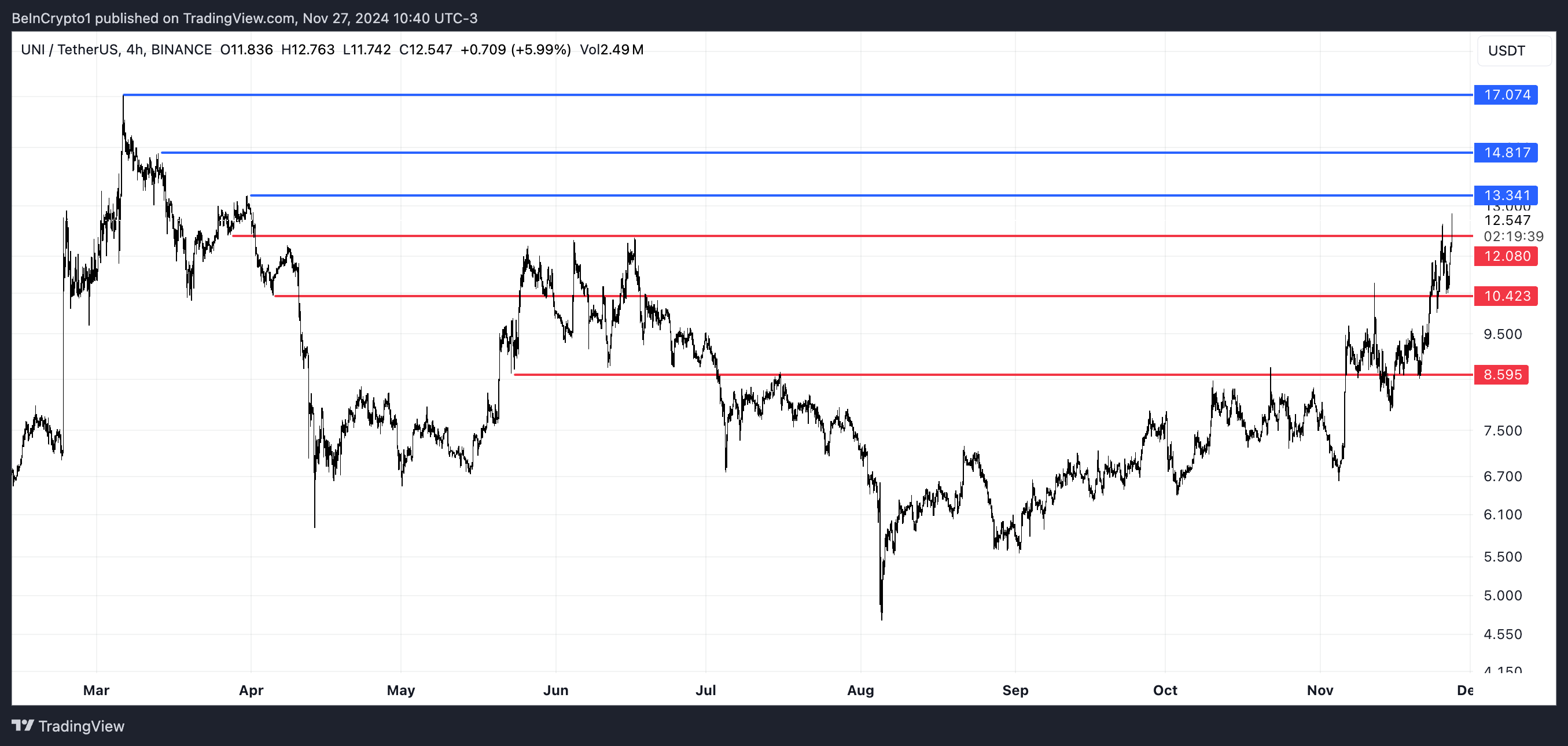 Hvis opptrenden fortsetter, kan UNI teste motstand på $ 13,3 og $ 14,8, med en potensiell økning til $ 17, men en reversering kan føre til at den tester støttenivåer på $ 12 eller faller til $ 8,59.