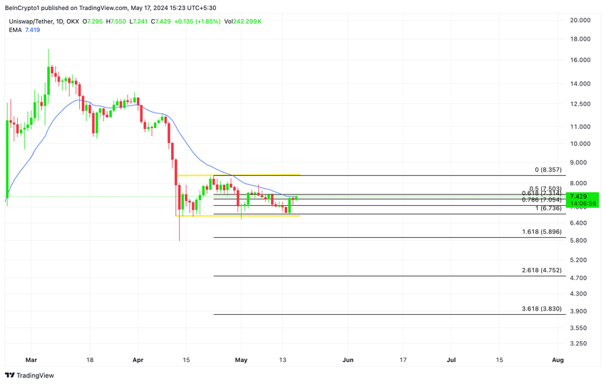 Hvis det bearish presset øker og UNI reverserer sin nåværende trend, kan prisen falle til $ 7.06 og gå mot støtte på $ 6.73.