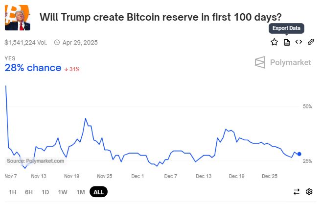 Prognoseplattformer og analytikere presenterer motstridende synspunkter på sannsynligheten for at Bitcoin blir en del av USAs reserve-strategi. På Polymarket gir brukere kun en 29 % sannsynlighet for at President-elect Donald Trump vil innføre en Bitcoin-reserve innen sine første 100 dager i embetet. Dette markerer en bratt nedgang fra optimismen etter valget, hvor oddsen nådde 60 %.