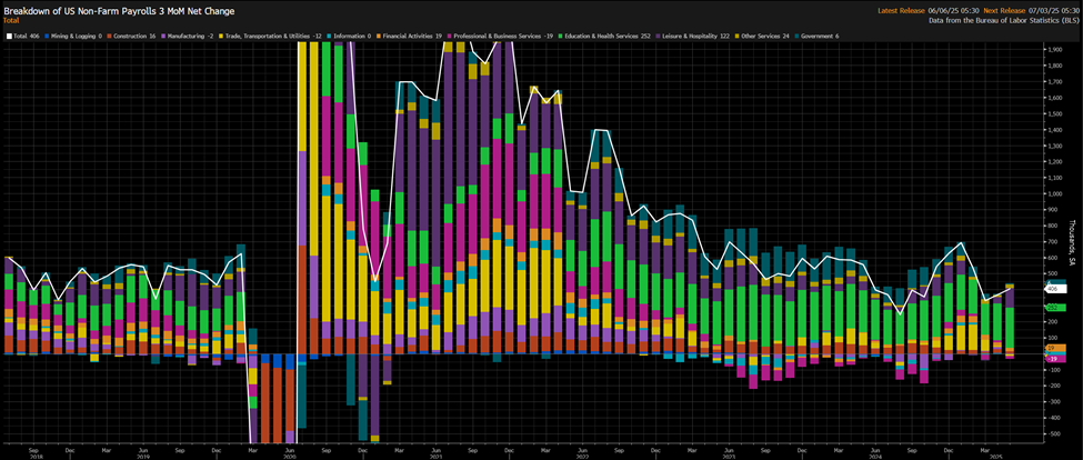 Den amerikanske sysselsettingsrapporten, eller Non-Farm Payrolls (NFP) for juni 2025, er planlagt for utgivelse 3. juli. Økonomien la til 139 000 jobber i mai, etter å ha lagt til 177 000 jobber i april.
