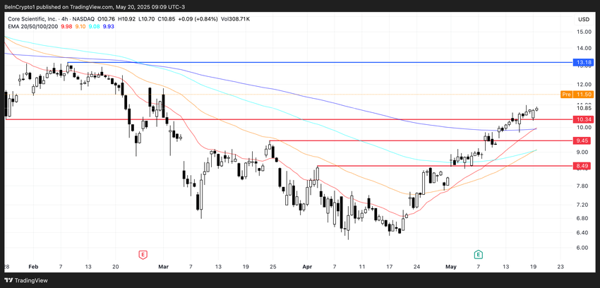 CORZs diagram viser tegn på fornyet styrke, med en potensiell gyllen kors som dannes på sine EMA-linjer. Analytikeres sentiment forblir overveldende bullish—16 av 17 analytikere vurderer aksjen som enten en “Sterk Kjøp” eller “Kjøp,” med et ettårig kursmål på gjennomsnittlig $ 18,28, som representerer en potensiell oppside på 68,49 %.
