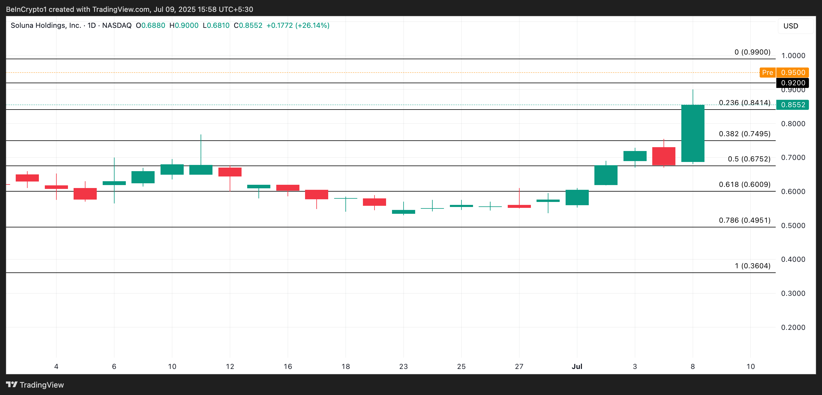 I førmarkedssesjonen i dag handles SLNH til $ 0,95. Hvis oksene holder kontrollen ved åpningsklokken, kan aksjen teste motstand nær $ 0,99.