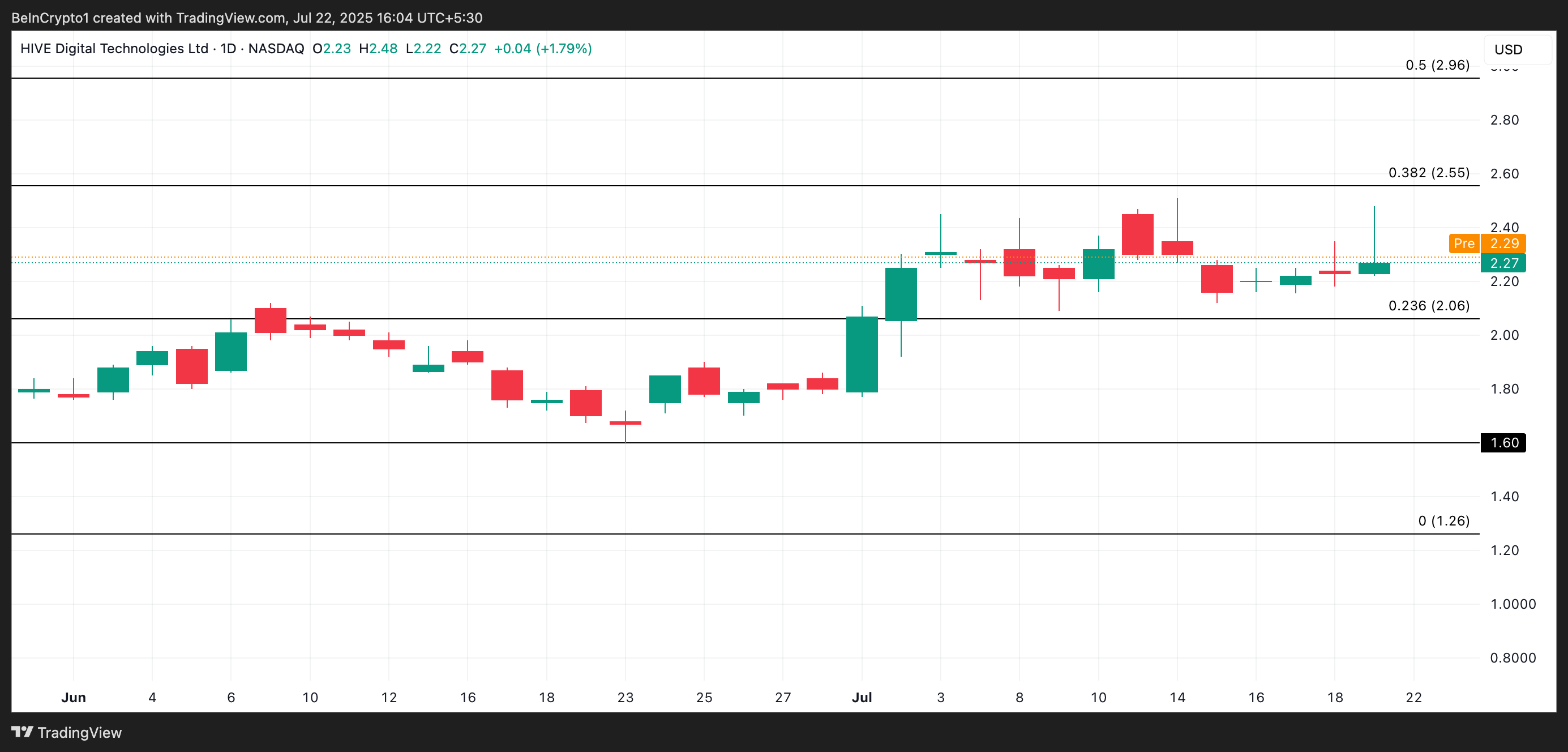 Under pre-marked handelssesjonen i dag, handles HIVE-aksjer til $ 2,29. Hvis etterspørselen styrkes når markedet åpner, kan aksjen stige mot $ 2,55 motstandssonen.