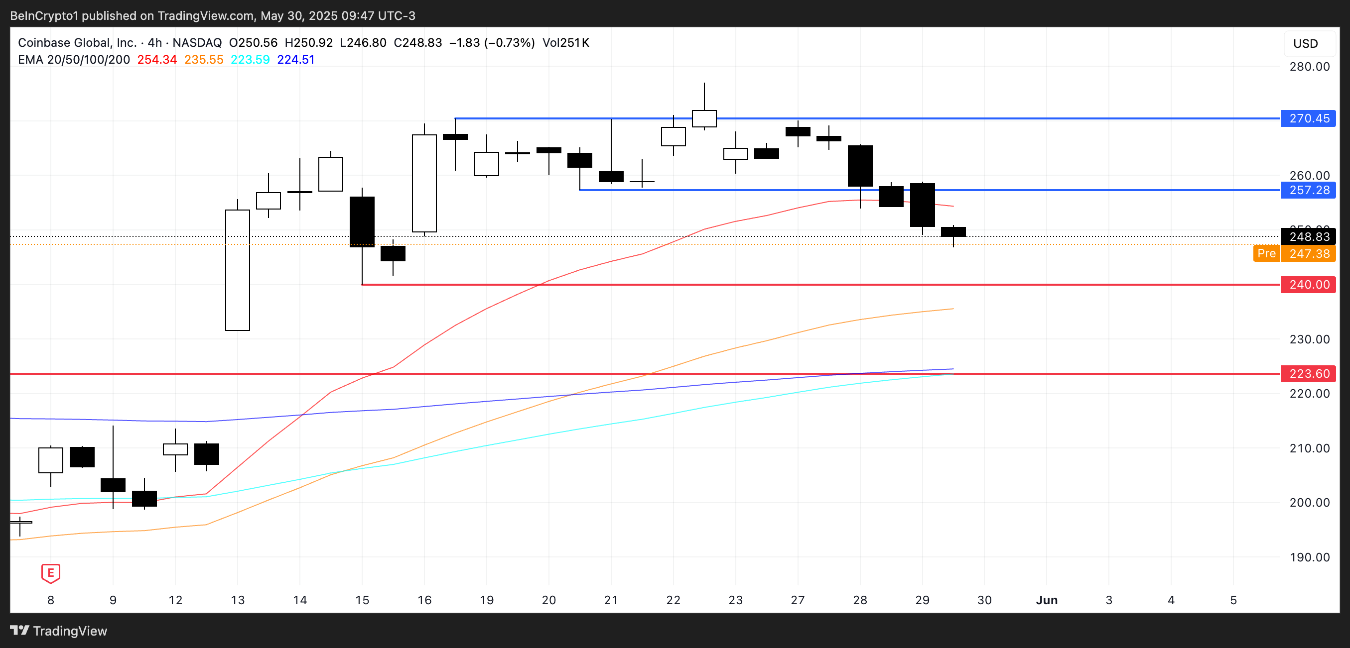 Omvendt, hvis trenden snur, kan COIN teste motstand på $ 257, med et potensielt brudd som kan presse den til $ 270,45.