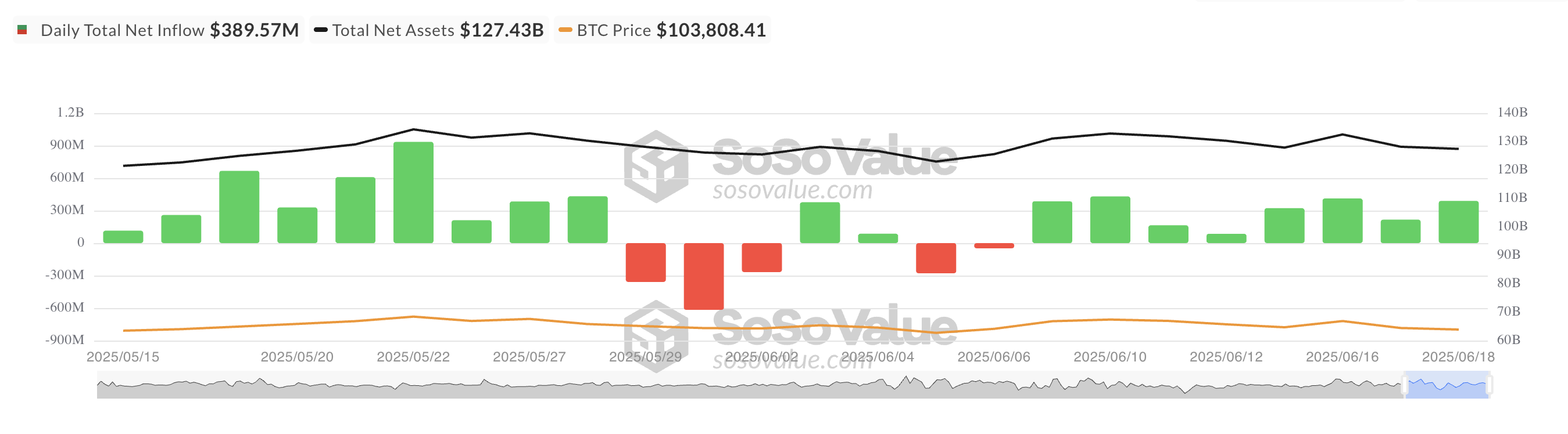 På onsdag registrerte BTC ETF-er netto innstrømninger på nesten $ 390 millioner, som markerer den åttende dagen på rad med netto positiv bevegelse inn i aktivaklassen. Tallet representerer en økning på 80 % fra $ 216 millioner registrert dagen før, noe som fremhever en fornyet bølge av institusjonell investorinteresse.