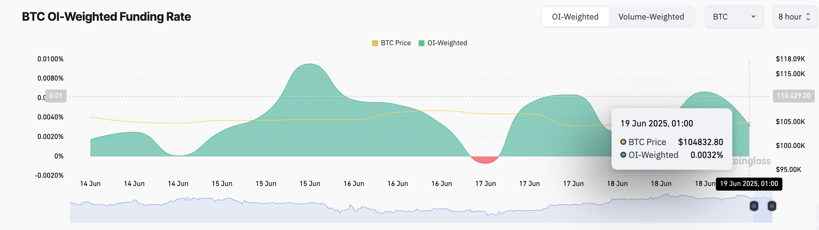 Når en aktivas finansieringsrate er positiv som dette, betaler long-posisjonsholdere shorts, noe som indikerer at bullish sentiment dominerer markedet.
