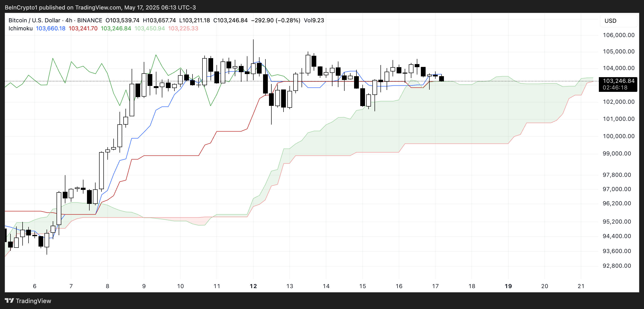Chikou Span (grønn etterslepende linje) er litt over priskandelabrene, noe som antyder en mild bullish bias, men totalt sett signaliserer diagrammet usikkerhet og behovet for et utbrudd for å bekrefte neste retning.