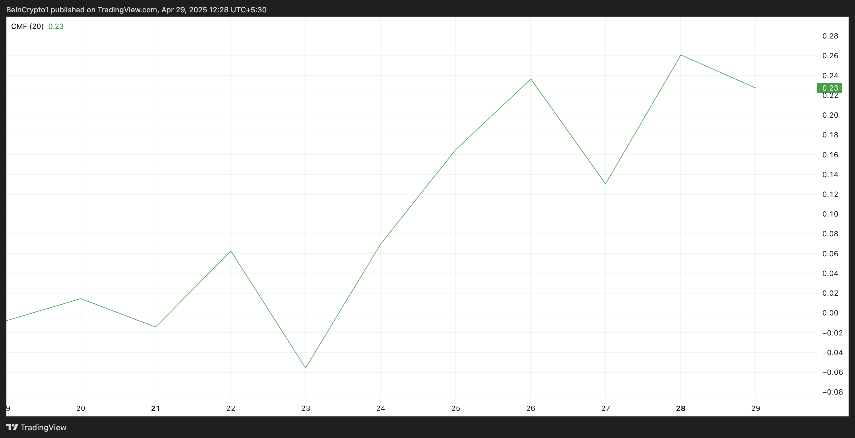 Avlesninger fra VIRTUALs Chaikin Money Flow (CMF) indikator, som sporer kapitalakkumulering i en aktiva, bekrefter den høye etterspørselen etter altcoinen. På presstid er denne momentumindikatoren over null-linjen og i en oppadgående trend på 0,23.