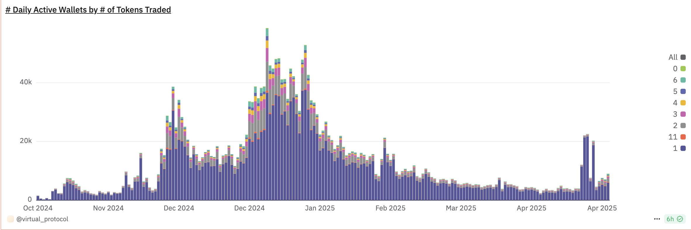 I følge Dune Analytics har antallet unike aktive lommebøker som holder Virtual Agents’ tokens på tvers av Base- og Solana-blokkjeder hoppet med 95 % de siste fem dagene.
