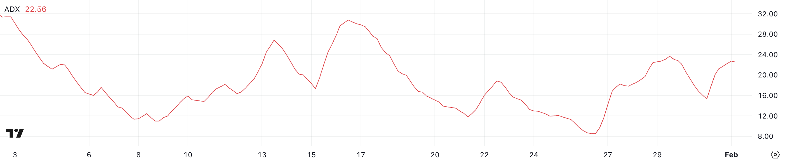En av de ledende AI-agent-tokenene, Virtuals Protocol, har opplevd en ukelang nedgang drevet av den siste DeepSeek-hypen. Tokenets ADX (Average Directional Index) er for øyeblikket på 22,5, opp fra 15,3 bare en dag siden, noe som indikerer en styrkende trend.