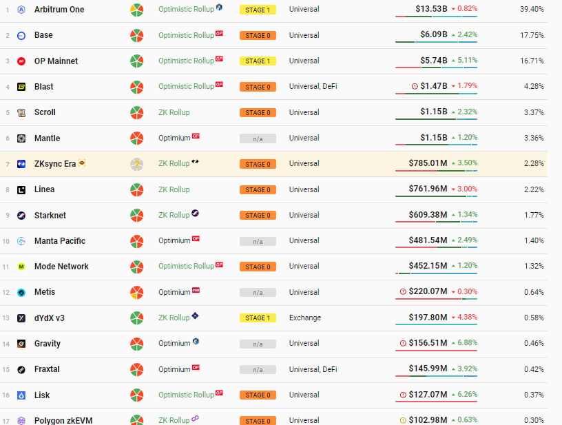 L2Beat, et analyse- og forskningsnettsted fokusert på Ethereum Layer-2-skaleringsløsninger, lister opp flere rollups som har nådd Fase 1 eller høyere. Disse inkluderer Arbitrum, OP Mainnet, dYdX v3, og Zksync Lite, alle i Fase 1. I mellomtiden har Fase 2-rollups, som har oppnådd full desentralisering med “null opplæringhjul,” inkludert DeGate V1 og Fuel V1.