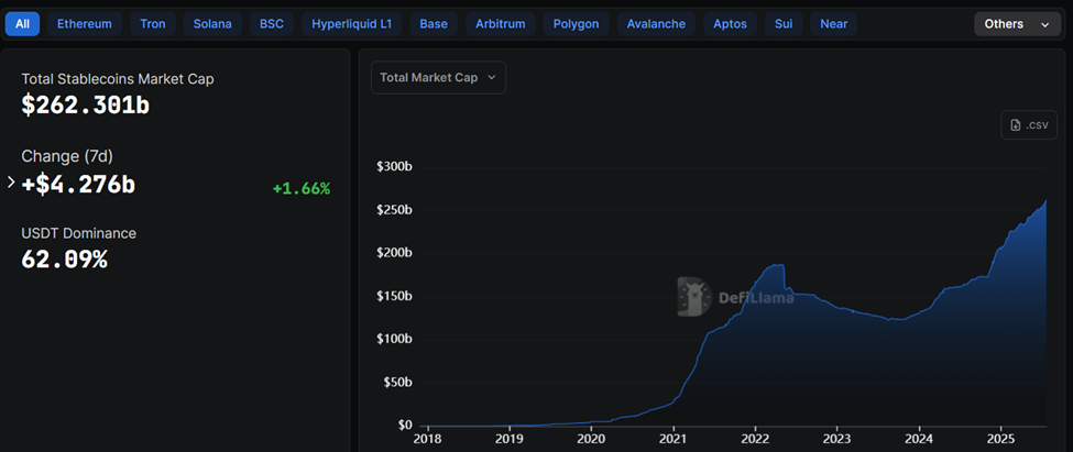 Data fra DefiLlama viser at den totale markedsverdien for stablecoins er på et rekordhøyt nivå på $ 262,301 milliarder.