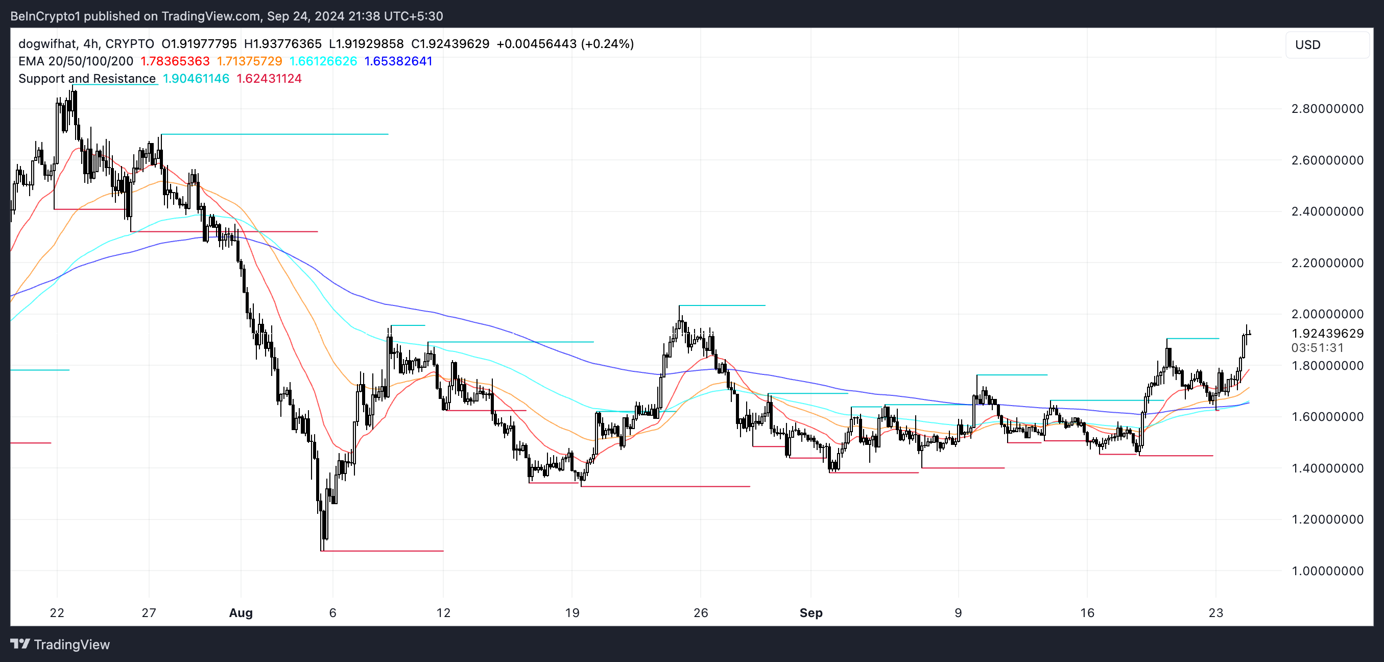 EMA-linjene for WIFs pris indikerer en jevn oppadgående trend, noe som tyder på et positivt utsyn. Denne trenden antyder at meme coin kan overstige $ 2,7-nivået igjen snart.